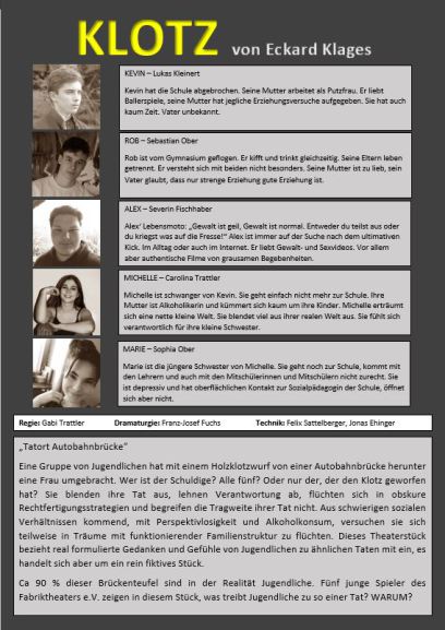 hat sich für das diesjährige freiwillige Abschlussprojekt der Klasse 10 in Zusammenarbeit mit der AWO gemeldet, ein Theaterstück mit dem Titel „Klotz“ von Eckard Klages.